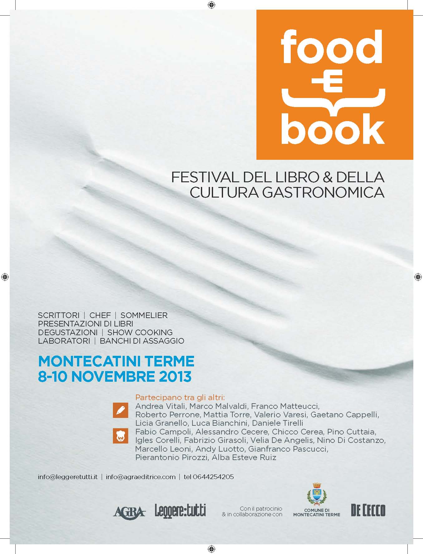 Food&Book è organizzato da Agra editrice e dal mensile Leggere:tutti, in collaborazione con il Comune di Montecatini Terme, Terme di Montecatini Spa, con il contributo di Pasta De Cecco, Conad del Tirreno, Parmigiano Reggiano, Banca Mediolanum, la partecipazione di Vetrina Toscana e Altromercato e la partnership di Italo.