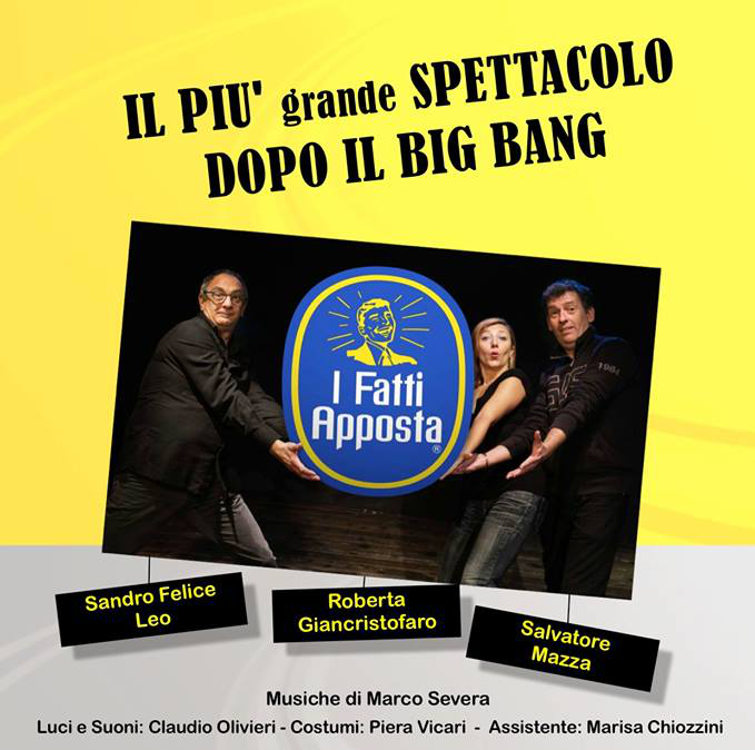 Dal 29 novembre al 1 dicembre il Teatro Piccolo Re di Roma ospita un irriverente spettacolo di comicità. Sandro Felice Leo, Roberta Giancristofaro e Salvatore Mazza, sono i protagonisti de Il più grande spettacolo dopo il big bang. Un progetto comico che nasce insieme ad un nuovo trio artistico: I Fatti Apposta. Ideatore di questa compagnia è Felice Sandro Leo regista dello spettacolo.