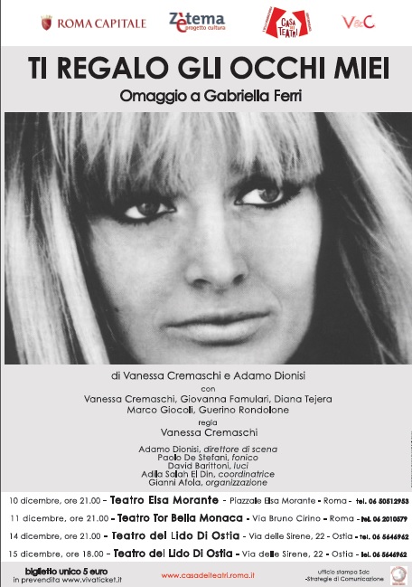 Il mito di Gabriella Ferri rivive nei teatri romani, dal 10 al 15 dicembre, con lo spettacolo “Ti regalo gli occhi miei”: un concerto omaggio alla grande artista ed alla sua musica, ideato da Vanessa Cremaschi e Adamo Dionisi nel 71esimo anno dalla nascita. Lo spettacolo è un viaggio tra le sue canzoni, di cui alcune scritte assieme al padre Vittorio, le reinterpretazioni della canzone tradizionale romana e frammenti di riflessioni della stessa Ferri.