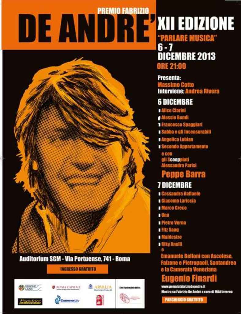 il 6 e il 7 dicembre all’Auditorium SGM di Roma ci sarà la fase conclusiva della dodicesima edizione della rassegna Premio Fabrizio De Andrè “Parlare Musica” che gode del PATROCINIO DALLA “FONDAZIONE FABRIZIO DE ANDRÉ ONLUS”