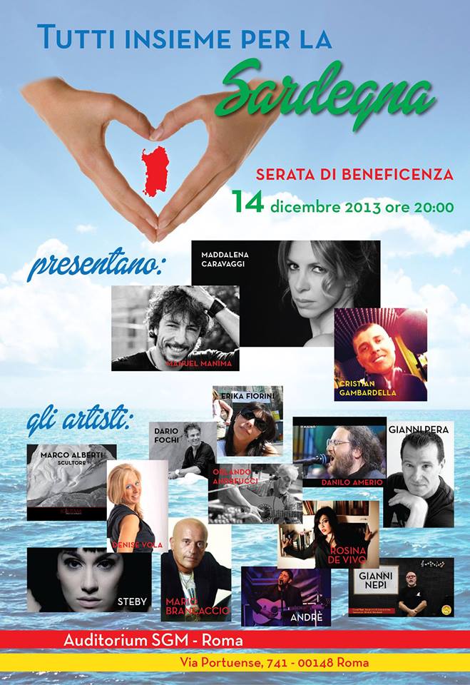 Rita Speranza, Danilo Amerio, Mario Brancaccio, Gianni Nepi, Andrè, Dario Fochi, Orlando Andreucci e tanti altri artisti, insieme per la serata di beneficenza in aiuto della Sardegna.Lo straordinario evento di solidarietà, che avrà luogo il 14 dicembre 2013 all’Auditorium SGM di Roma, a partire dalle ore 20, contribuirà a sostenere con un’asta di beneficenza gli alluvionati della città di Torpè (NU) in Sardegna
