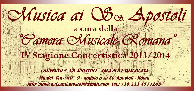 L’appuntamento per il prossimo concerto della stagione concertistica “Musica ai Ss. Apostoli 2013/14” è ufficialmente fissato per Domenica 12 Gennaio 2014 alle ore 18:30 presso il CONVENTO S. XII APOSTOLI – SALA dell’IMMACOLATA – Via del Vaccaro, 9 Roma.