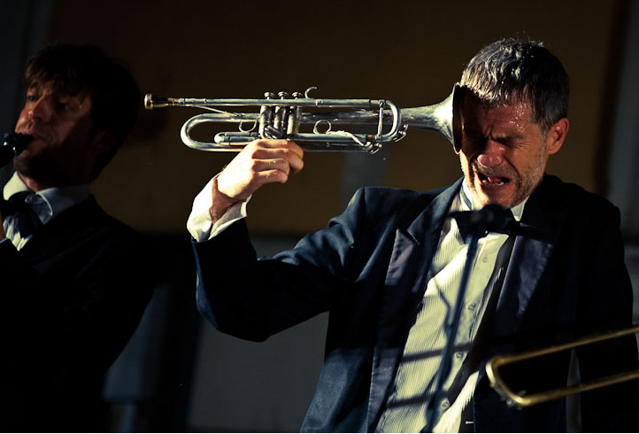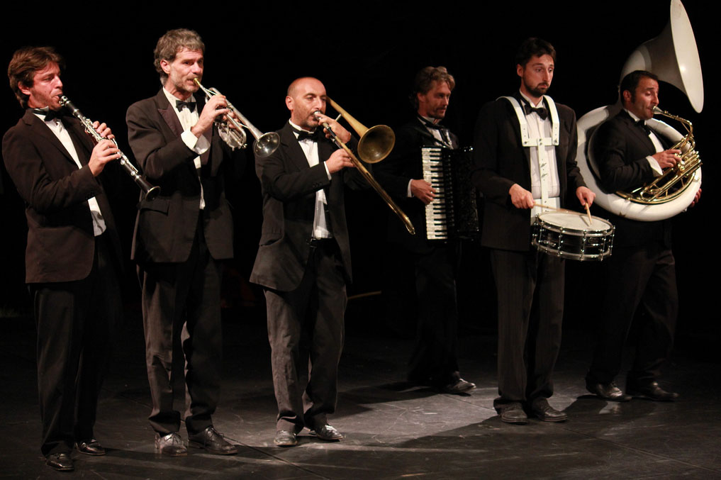Un’orchestra di sei musicisti in smoking, formata da Jacopo Rugiadi (clarinetto), Rodolfo “Foffo” Sarli (trombone), Giordano Geroni (sassofono), Francesco Masi (tromba), Gabriele Stoppa (batteria) e Alberto Becucci (fisarmonica) trascinerà gli astanti in atmosfere musicali retrò con suggestioni circensi e colori felliniani, presentando un concerto-spettacolo pieno di sorprese e colpi di scena, all’interno di un immaginario Tabarin, con rocambolesche attrazioni e deliri “comiconirici”, come in un varietà d’altri tempi.