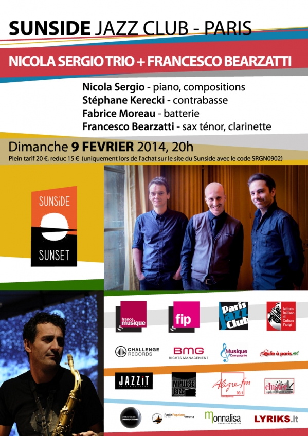 Nicola Sergio Domenica 9 febbraio torna Live al Sunside di Parigi per un emozionante concerto che avrà come special guest Francesco Bearzatti, sassofonista tra i più importanti a livello internazionale ( Musician Award 2011 Accademia Europea di Jazz ) . Nasce così un emozionante viaggio intorno ai temi del album Symbols (2010) e lllusions (2012) e riguardo al nuovo progetto Migrants (piano solo / vidéo / mise en scène).