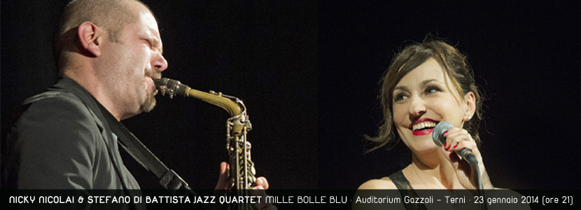 Nicki Nicolai & Stefano Di Battista Jazz Quartet in “Mille Bolle Blu” – 23 gennaio: è un’esclusiva regionale l’appuntamento che avrà come protagonisti l’inconfondibile voce di Nicki Nicolai e l’estro creativo di uno dei più noti musicisti jazz italiani, Stefano di Battista. Coppia nella vita e coppia artistica sul palcoscenico, a Terni, accompagnati da uno straordinario Trio – Andrea Rea al pianoforte, Roberto Pistolesi alla batteria, Daniele Sorrentino al contrabbasso – reinterpreteranno gli anni d’oro della musica italiana e internazionale in chiave swing e jazz, proponendo brani come “Se stasera sono qui”, “Non gioco più”, “Se telefonando…”, “Che sarà”, fino a “All my loving” e “Smoke on the water”…