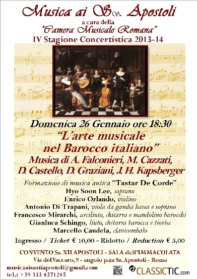 Domenica 26 Gennaio 2014 alle ore 18:30 presso il CONVENTO S. XII APOSTOLI – SALA dell’IMMACOLATA – di Via del Vaccaro, 9 – angolo p.za Ss. Apostoli – la Formazione di Musica Antica “Tastar de corde” terrà il concerto “L’arte musicale nel Barocco italiano” Musica di A. Falconieri, M. Cazzati D. Castello, D. Graziani, J. H. Kapsberger. Un concerto allegro, leggero, danzante… come allegra, leggera e danzante è la musica italiana rinascimentale e barocca in un’atmosfera sapientemente richiamata dai musicisti attraverso l’impiego di copie storiche e strumenti originali d’epoca.