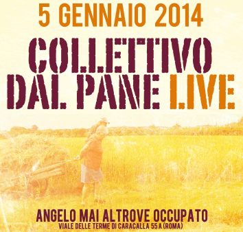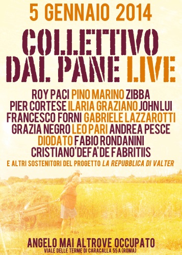 Dopo l’anteprima di Faenza, in occasione della quale è uscito il cd “La Repubblica di Valter” del neonato ensemble “Collettivo Dal Pane”, in memoria dell’amico faentino Valter Dal Pane, prematuramente scomparso, formato dai migliori artisti della scena indipendente della nuova musica d’autore quali Roy Paci, Zibba, Roberto Angelini, Pino Marino, Pier Cortese, Leo Pari, Grazie Negro, Ilaria Graziano, John Lui, Gabriele Lazzarotti, Andrea Pesce, Daniele “Il Mafio” Tortora e Fabio Rondanini. si esibirà il 5 gennaio 2014 presso l’Angelo Mai Altrove Occupato di Via delle Terme di Caracalla n. 55 a Roma.